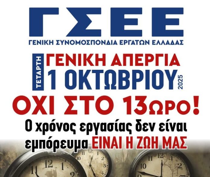 Η Ε.ΤΕ. Ομίλου ΔΕΗ – ΚΗΕ συμμετέχει δυναμικά στην 24ωρη Γενική Απεργία, που διοργανώνει η Γενική Συνομοσπονδία Εργατών Ελλάδας (ΓΣΕΕ), την Τετάρτη 1 Οκτωβρίου 2025, ενισχύοντας τις διαμαρτυρίες των εργαζομένων για την θεσμοθέτηση του 13ωρου εργασίας που αποτελεί επιστροφή στον εργασιακό μεσαίωνα.