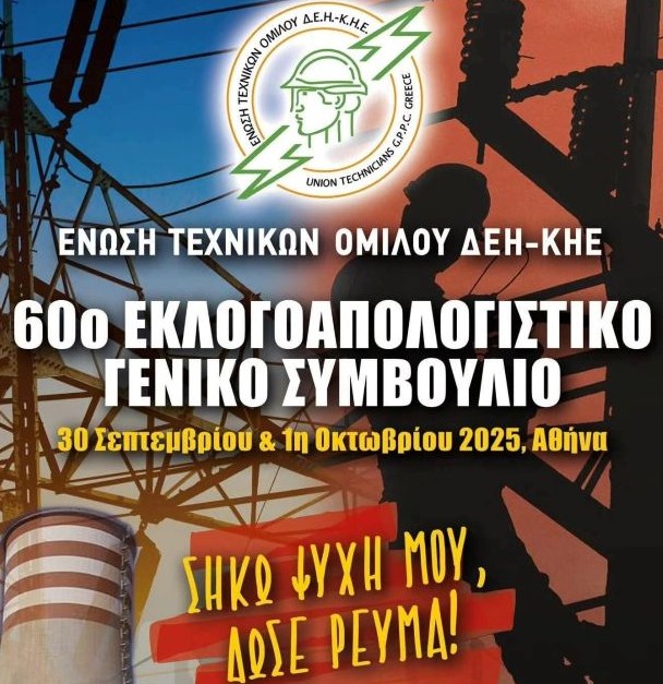 Οι σύνεδροι του 60ου Γενικού Εκλογοαπολογιστικού Συμβουλίου, που συνεδρίασε στην Αθήνα στις 30 Σεπτεμβρίου & 1 Οκτωβρίου 2025 και τα μέλη της Ε.ΤΕ. ΟΜΙΛΟΥ ΔΕΗ-ΚΗΕ, που συμμετείχαν στην Γενική Συνέλευση που πραγματοποιήθηκε στον ίδιο χώρο. Αποφασίσαμε: